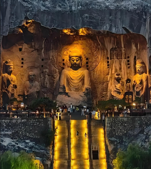 Las Cuevas de Longmen son un sitio Patrimonio de la Humanidad con más de 100.000 estatuas budistas talladas en la roca. La más famosa es la Gran Buda Vairocana, con 17 metros de altura.